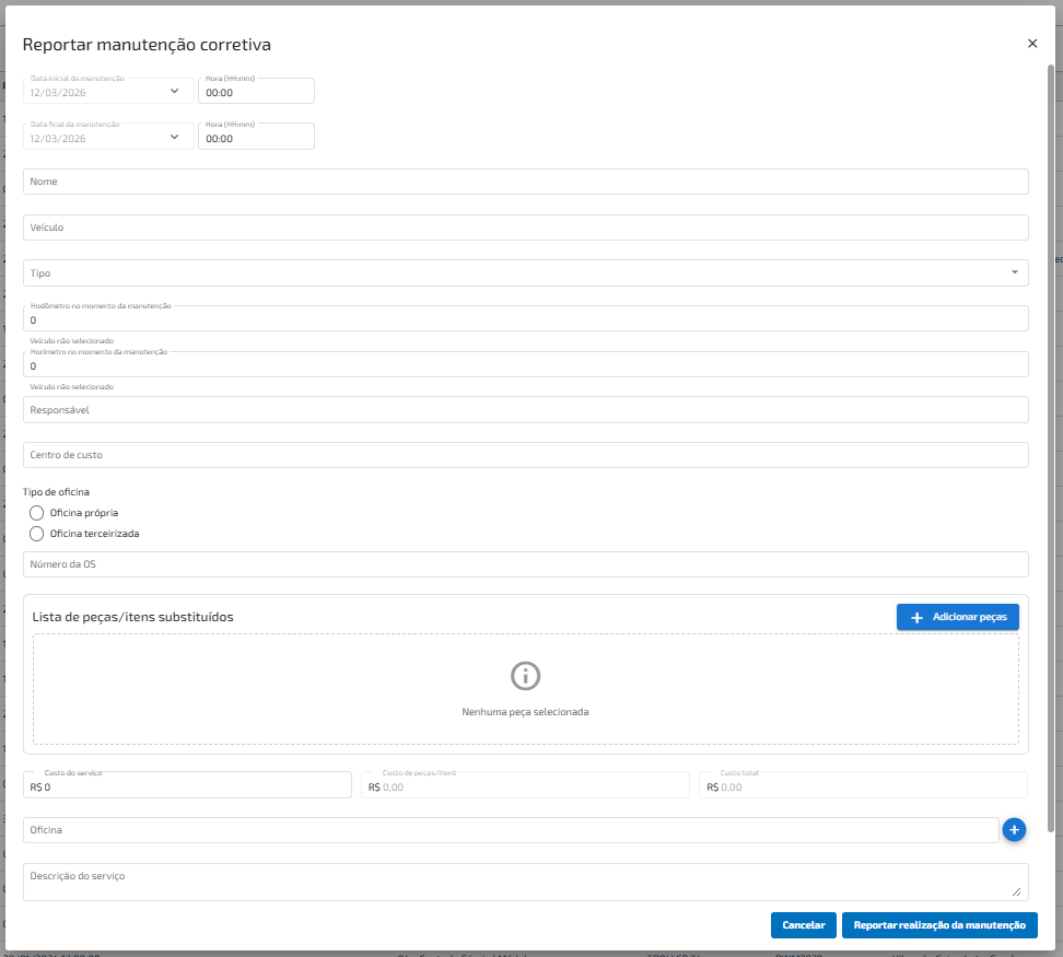 Clique em "Nova manutenção corretiva" e uma janela irá ser aberta para o cadastro dos dados da manutenção.