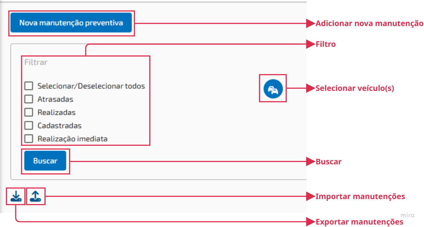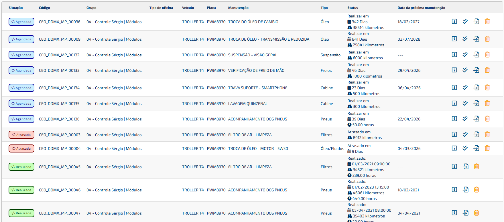 - BUSCAR: Clique para listar todas as manutenções preventivas do veículo selecionado de acordo com o status do filtro selecionado.