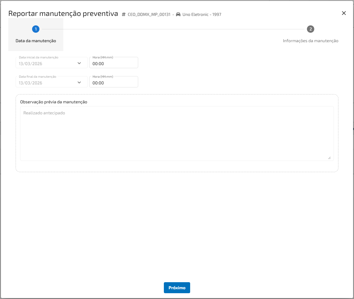 Imagem 7 - Etapa 1 do modal "Reportar manutenção preventiva"
