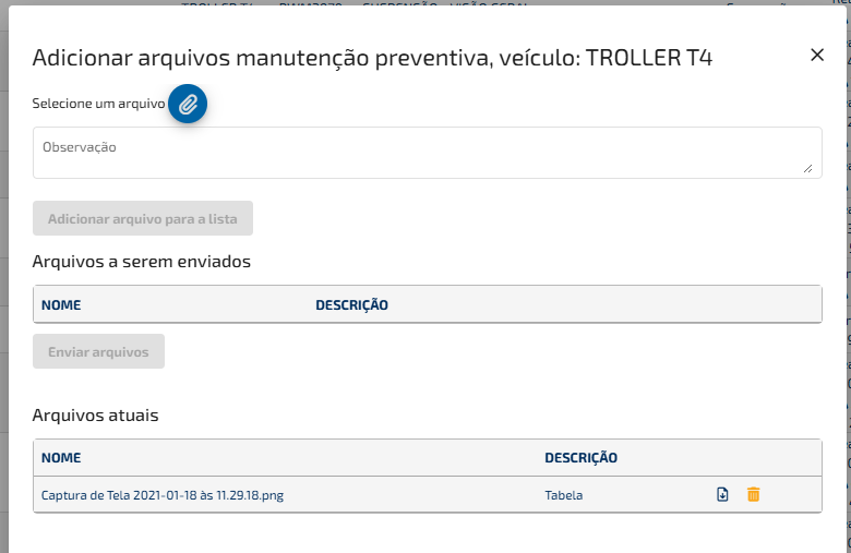 Imagem 9 - Modal de "Adicionar arquivos manutenção preventiva, veículo:"
