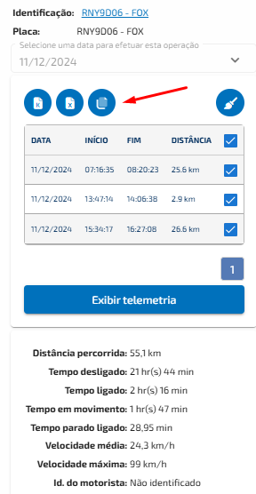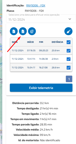 O download será iniciado automaticamente. Caso o usuário queira baixar todos os pontos do veículo, mesmo em dias que não ocorrer rotas, basta baixar o arquivo no ícone "Exportar todos os pontos".