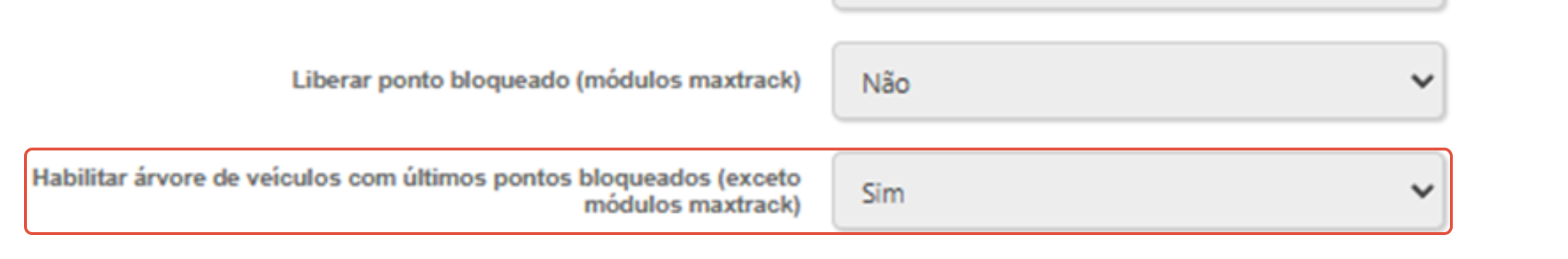 Dentro das configurações da conta selecionada, localize a opção denominada “Habilitar árvore de veículos com últimos pontos bloqueados (exceto módulos Maxtrack)”. Por padrão, essa configuração estará desativada com o valor “Não”. Altere a configuração para “Sim”.