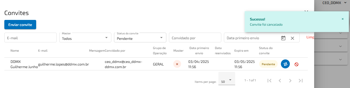 - Status do convite (Pendente/Aceito/Cancelado e Expirado);