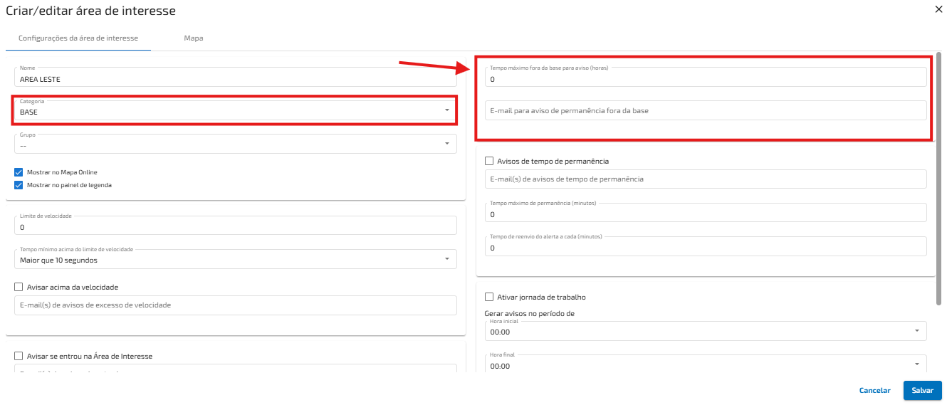 Ao definir a categoria da área como BASE, o sistema habilita dois campos adicionais de configuração: