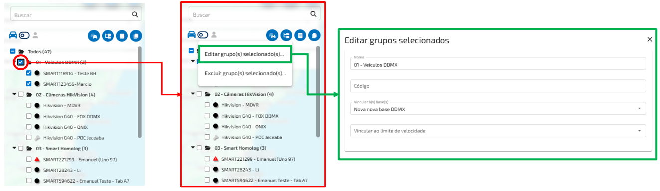 Somente após essa associação o alerta passará a ser considerado para o veículo. Para isso, selecione o grupo de veículos que deseja atribuir a base e clique em "Editar grupo(s) selecionado(s)", conforme imagem abaixo.