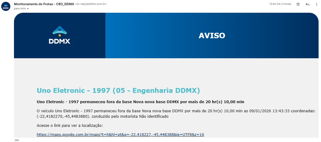 Se o tempo configurado for 3 horas, o sistema enviará um alerta a cada 3 horas enquanto o veículo permanecer fora da base.