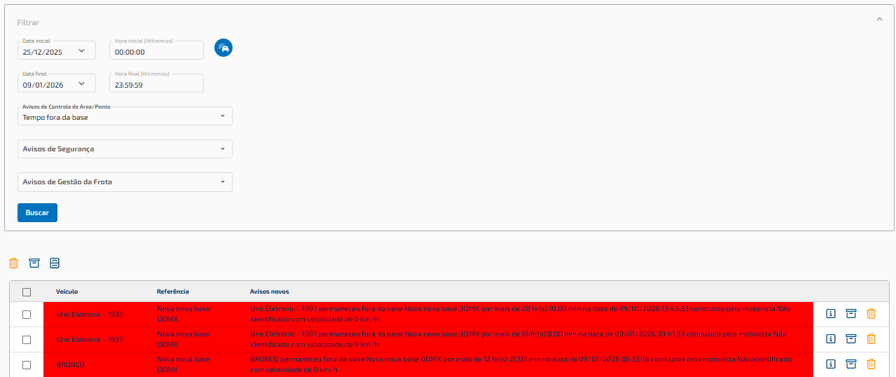 Atualmente, o sistema Triyax possui o alerta denominado “Tempo fora da base”, cujo objetivo é monitorar o período em que um veículo permanece fora de uma Área de Interesse classificada como BASE.